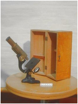 This is a simple microscope which achieves relatively small magnifications (3-5 times) and allows us to observe details of the object in high precision. It consists of a tube in which there are two converging lenses, the objective and the eyepiece ones. The subject to enlarge is placed into two tablets, and behind the tablets there is a reflector. In addition there is a screw by which we can achieve an appropriate focal length. The objective lens is located about 20cm from the eyepiece lens, from which we can look at the object. We pose the object AB between the two plates and in front of the objective lens (having short focal length) in a way that the lens itself form a real and magnified image A'B’. The A’B’ is formed between the optical center of the eyepiece and its main past. We observe the actual image A'B’ using the eyepiece lens which act as "magnifier" and give the final virtual image A’’B’’ inverted, and much bigger than the object AB and at equal distance to the distance of sharp vision. The microscope is accompanied with a wooden box.
