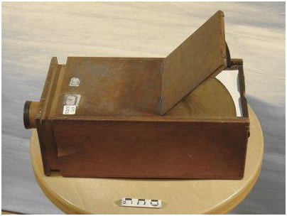 The instrument is called a darkroom. It is a wooden cuboit box which has on the one side converging lens (which collect the light rays from each point of the object) which can be easily moved in order to adjust the distance from the opposite side of the box and to control the focus of the image. Just at the opposite side of the box there is a translucent glass, so that the image of each object can be displayed (inverted) on the translucent glass because of the straight direction of light. We are able to observe that the relative sizes of the object and its image are proportional to their respective distances from the lens of the darkroom. Approaching the object, for instance, closer to the lens of the darkroom, the greater the size of its image is getting, and vice versa.